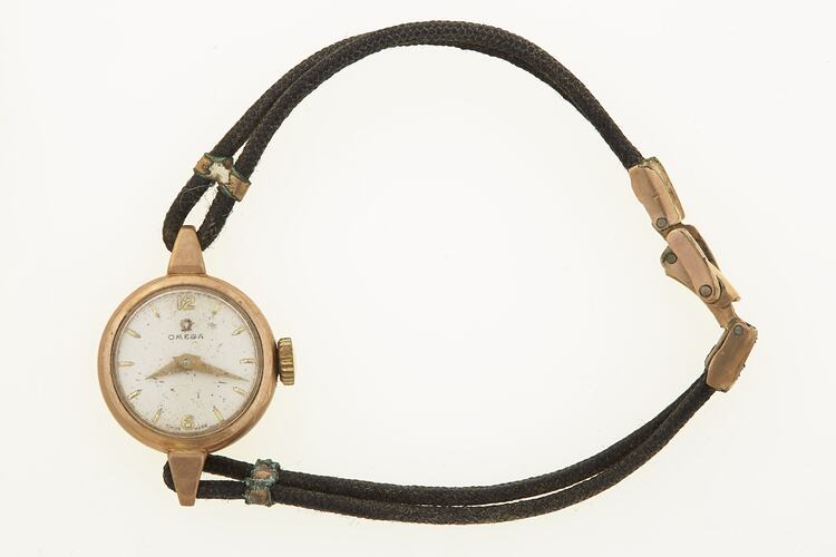 This watch belonged to Edna Clarice Sherriff (nee Wills), and was a gift from her husband, W.H. Sherriff, purchased in 1957 with part of his retirement present from the Victorian Railways. She wore the watch until her death in 1980.
