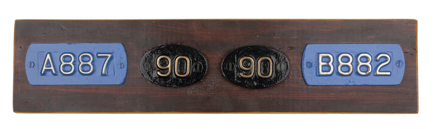 Four locomotive number plates mounted on wood, from a Victorian Railways 280 horsepower diesel railmotor, number 90. The power unit was made by Walker Brothers, Wigan, England, the body of the railmotor was made by Martin & King, Melbourne, and the units assembled by the Newport Workshops of the Victorian Railways, 1950-1954.