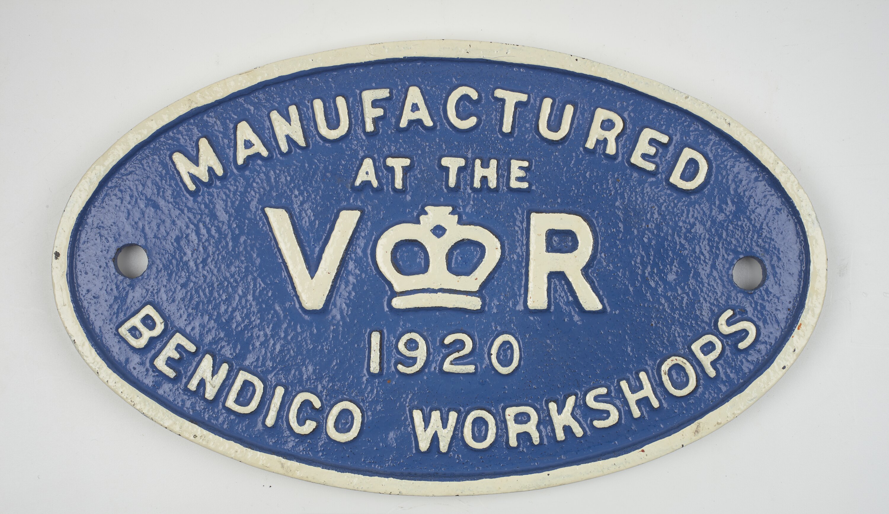 Cast iron oval locomotive builders plate, manufactured by Victorian Railways, Bendigo Workshops, 1920.