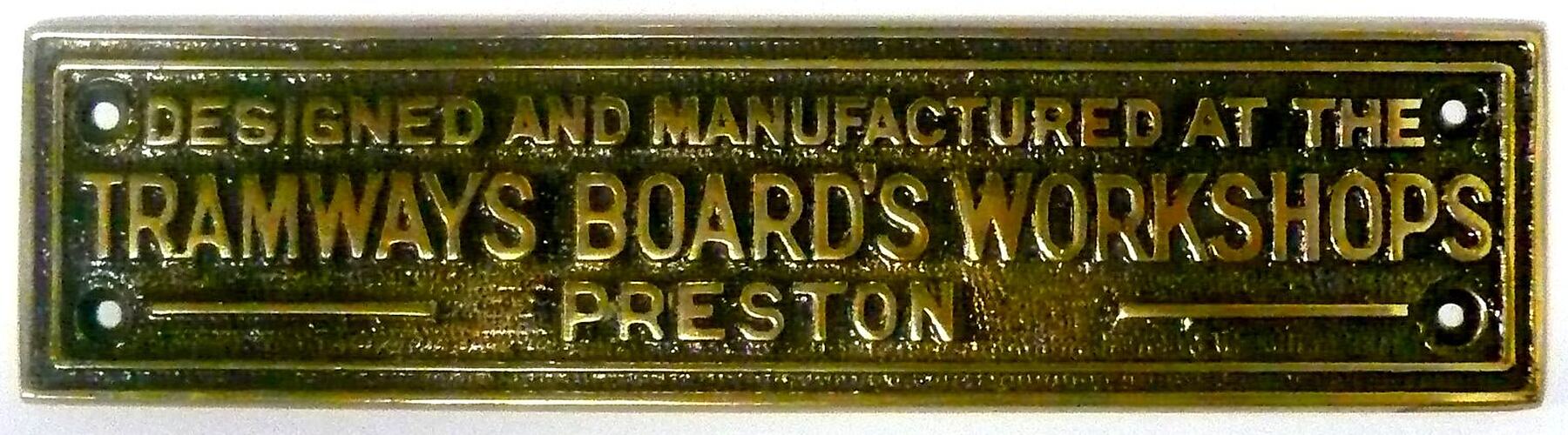Text: DESIGNED AND MANUFACTURED AT/THE TRAMWAYS BOARD'S WORKSHOPS/PRESTON.