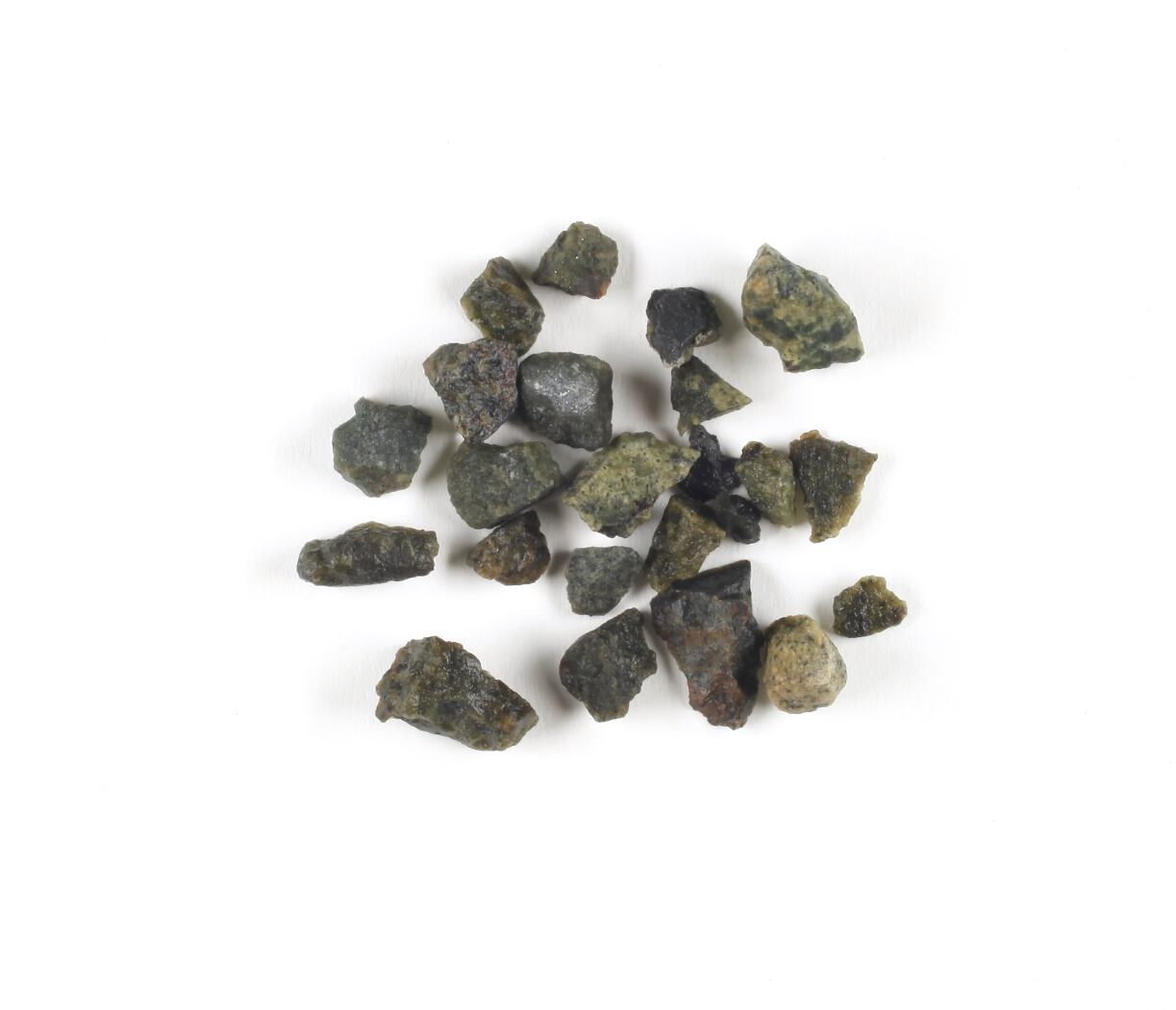 Granular pieces of Australian green serpentine used for making terrazzo. Colours appear as shades of mottled green with some rust coloured flecks. Colours present only when samples are moistened. Dry samples appear as shades of mid-grey. Samples are of a relatively consistant size. Samples contained in a jar with a card label with typed letters, most likely original museum object label.