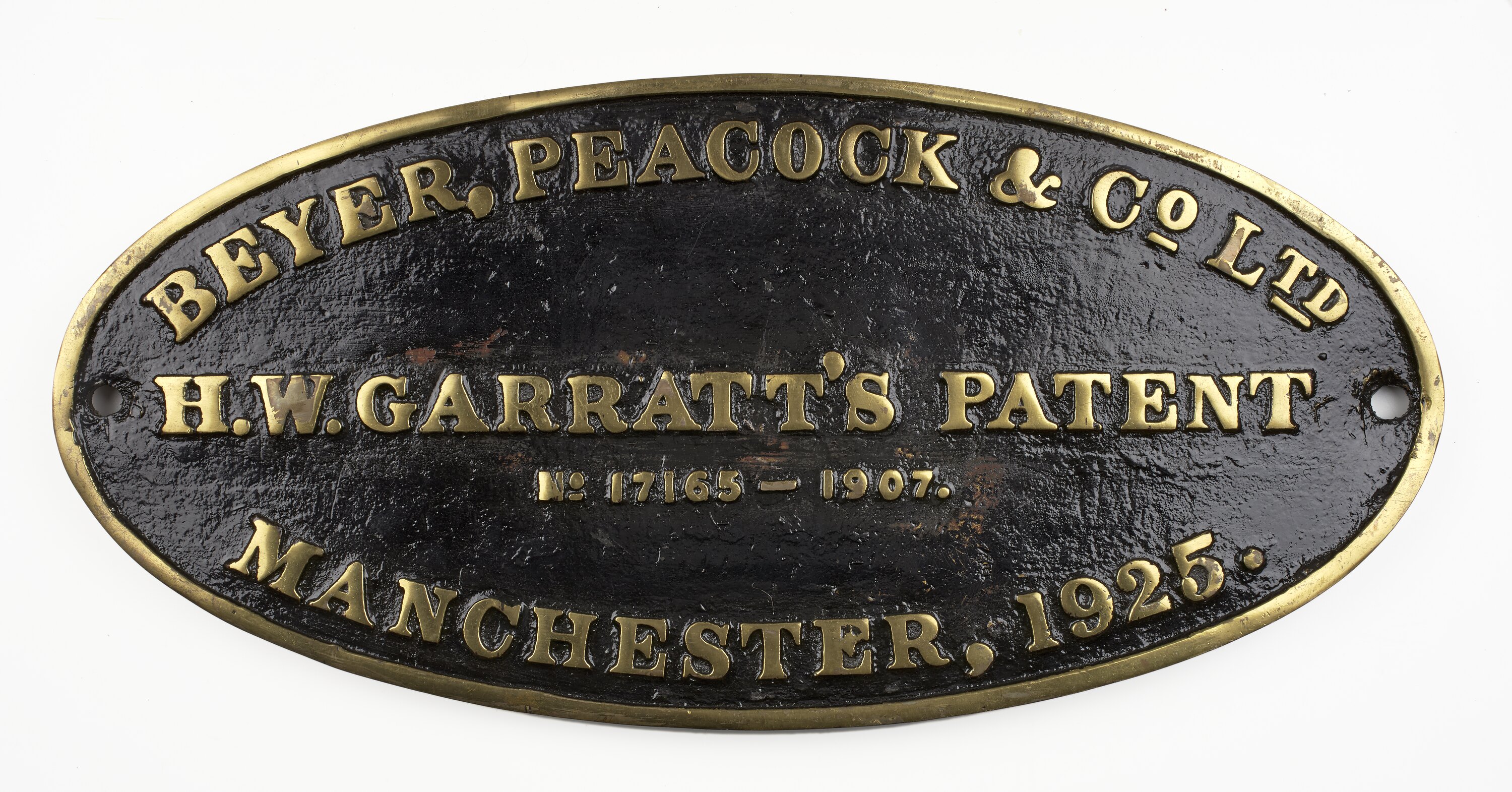 Brass oval locomotive builders plate, manufactured by Beyer Peacock & Co. Ltd., Manchester in 1925.