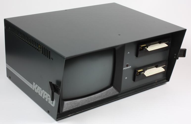 Kaypro Model 4 microcomputer. Comprises separable keyboard and VDU/disk drive package with two 5 1/4 inch disk drives and 9 inch (diagonal) green monochrome cathode ray tube screen. Mains operated. Runs CP/M operating system. Based on Z80a microprocessor chip. Made by Kaypro Corporation in California, United States of America in 1981.