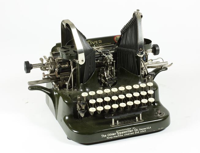 Typewriter of the type-bar class, manufactured by the Oliver Typewriter Company of Chicago, USA. Lateral downstroke design, patented in 1894 by Reverend Thomas Oliver, in which typebars of inverted U-shape are arranged on either side of the platen.