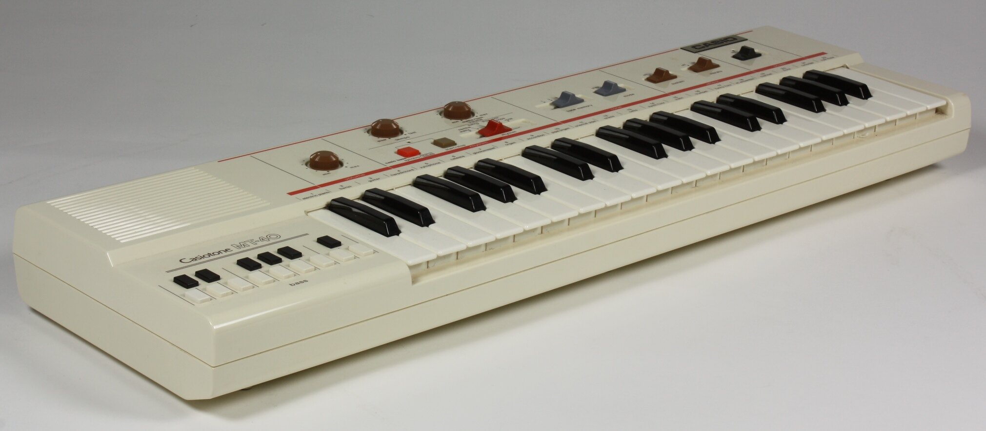 Casio "Casiotone MT40" electronic keyboard instrument. 37 keys, 8- note polyphonic with 22 preset timbres and 6 rhythms. Battery powered. Power consumption is 3.0 watt. Uses dedicated microprocessor (Intel 8048). Timbres formed by filters composed of discrete components. Made in Japan in 1982.