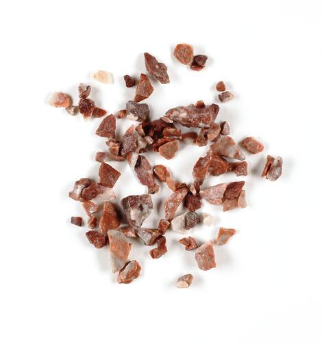 Granular pieces of Australian red marble used for making terrazzo. Colours range from maroon to pale ochre with some white pieces present. White is also present on some of the maroon and ochre pieces, a natural feature of the stone. Colours heightened when samples are moistened. Dry samples appear as shades of light brown or pink. Samples consist of both medium size and smaller pieces. Samples contained in a jar with a card label with typed letters, most likely original museum object label.