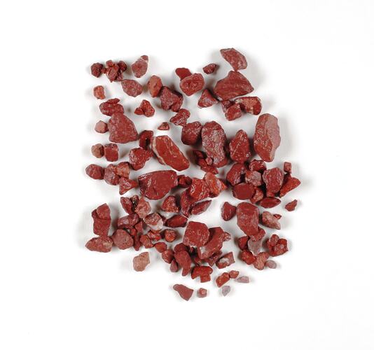 Granular pieces of Italian chocolate marble used for making terrazzo. Colour appears as vibrant red ochre with white marble veins present in some pieces. Colour heightened when moistened. Dry samples appear as shades of pink. Samples are very dusty and easily crumble. Samples consist of both medium size and smaller pieces (sizes No. 1 & 2). Samples contained in a jar with a card label with typed letters, most likely original museum object label.
