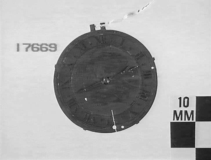Metal watch dial with half hinge at top. Dial centre engraved with scene of castle beside river, man fishing from bank and boat and swans on river. Roman numerals and a single hand shaped like an arrow and rotated by a gear wheel at back of face.