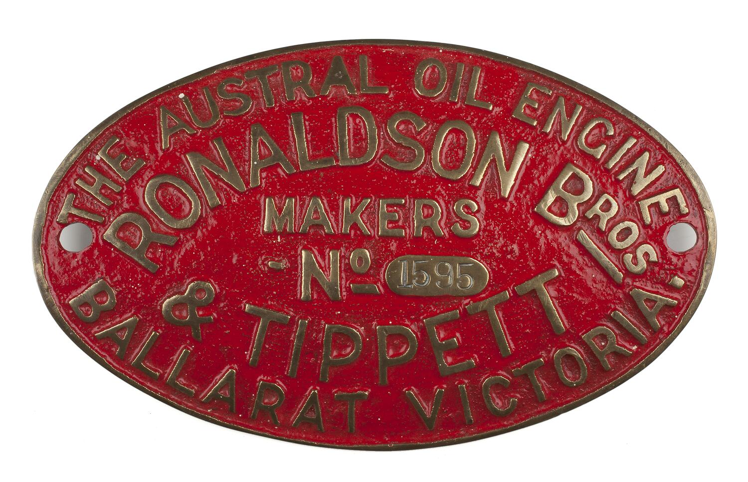 Engine plate from Austral Oil Engine, no. 1595, made by Ronaldson Bros & Tippett, Ballarat, Victoria, 1916.