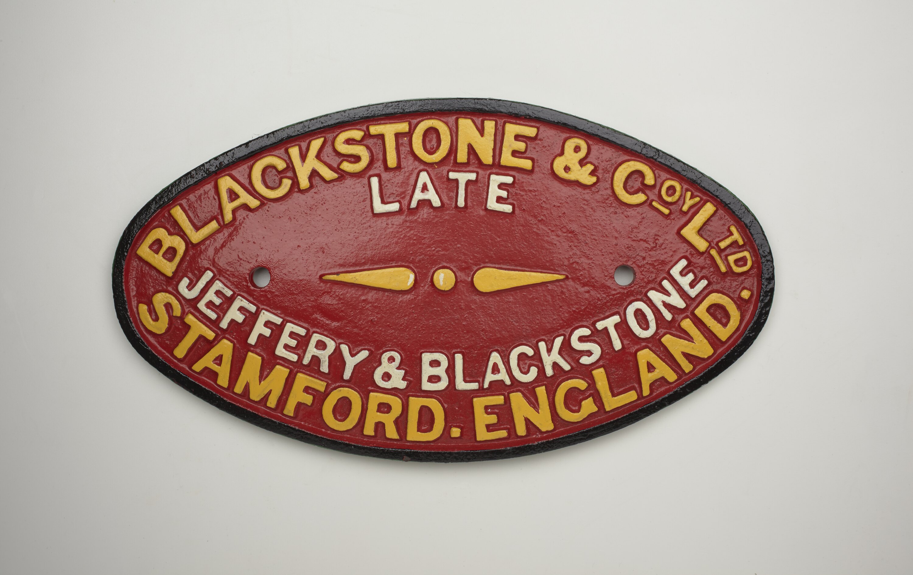 Builders plate form an internal combustion engine made by Blackstone & Co., Stamford, England. The company operated under this name from 1889 to 1937.