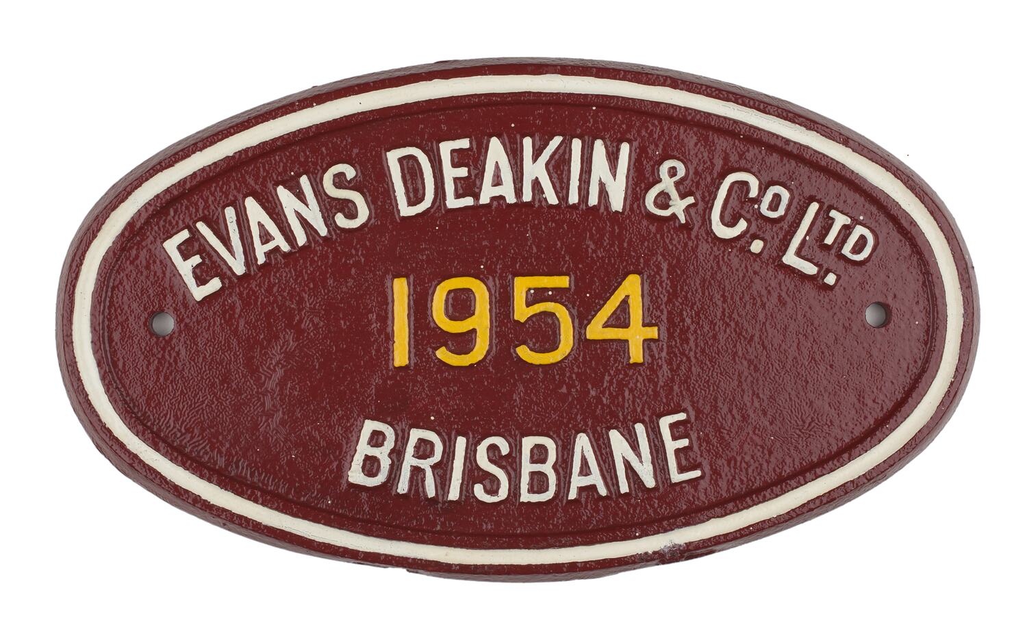 Builders plate for railway rollingstock, made by Evans, Deakin & Co., Brisbane, 1954. Used on rollingstock on Queensland Railways.