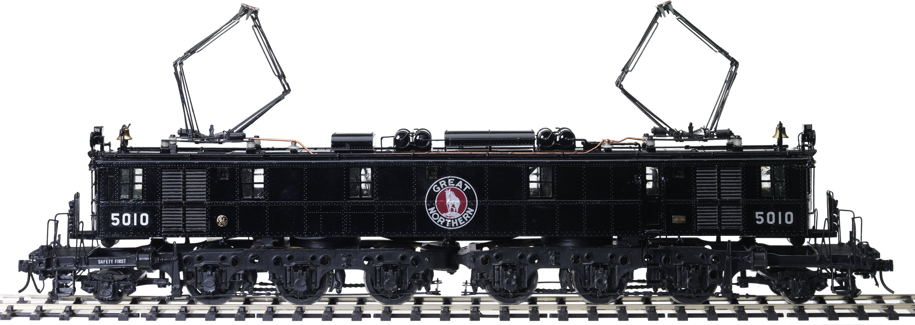 Scale model of 3,000 horsepower (2.2 MW) electric locomotive No.Y-5010, with AAR 1-C+C-1 wheel arrangement, built for the Great Northern Railway, by American Locomotive Co. (ALCO), Schenectady, New York, United States of America, with electrical components supplied by General Electric. The 16-wheel locomotive had two triple-driving-axle bogies and diamond pantographs at either end for 11 kV AC, 25 Hz, single-phase overhead-wire electrification, and used motor-generator sets to rectify the alternating current line voltage into direct current for their traction motors.