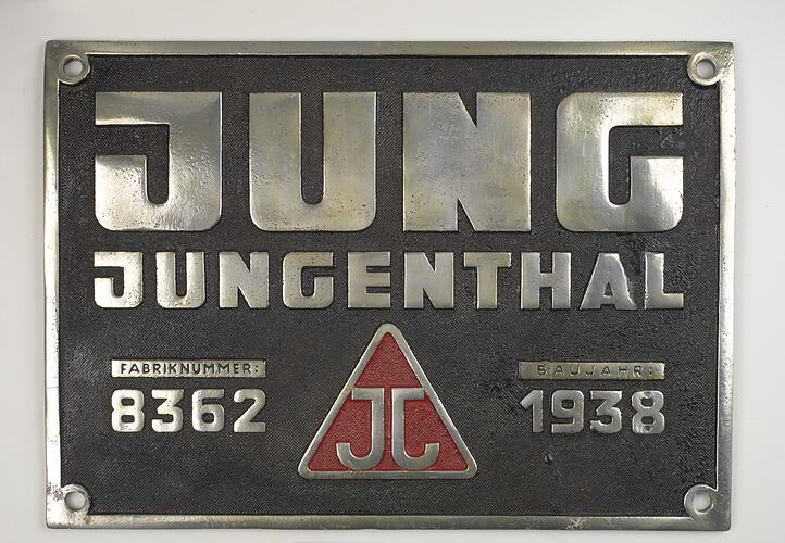 Aluminium rectangular locomotive builders plate, No. 8362, manufactured by Arnold Jung Lokomotivfabrik GmbH, Jungenthal in 1938.