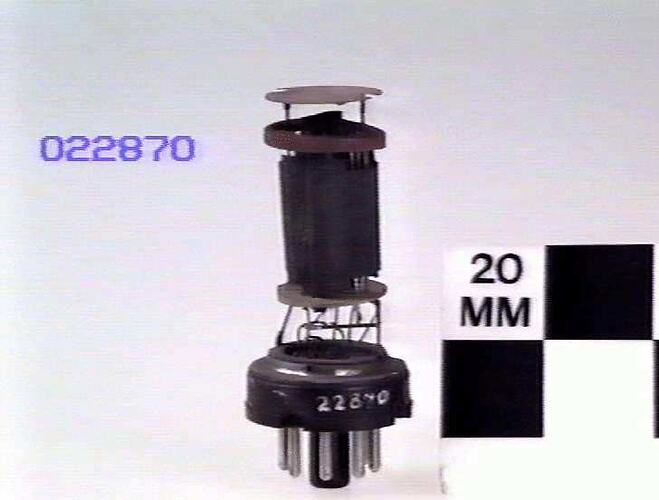 Internal structure of a metal valve made from metal and mica parts mounted on Octal base with 7 pins present. Mounted on display block with a complete example of the same type (ST 021534).