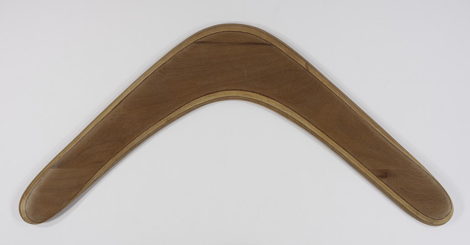 Plywood boomerang made by former Victorian boomerang throwing champion, Denis Maxwell. Burnt into wood on back of boomerang 'D.M.' below a logo of an emu. Ends of boomerang are champfered on rear to form aerofoil profile.