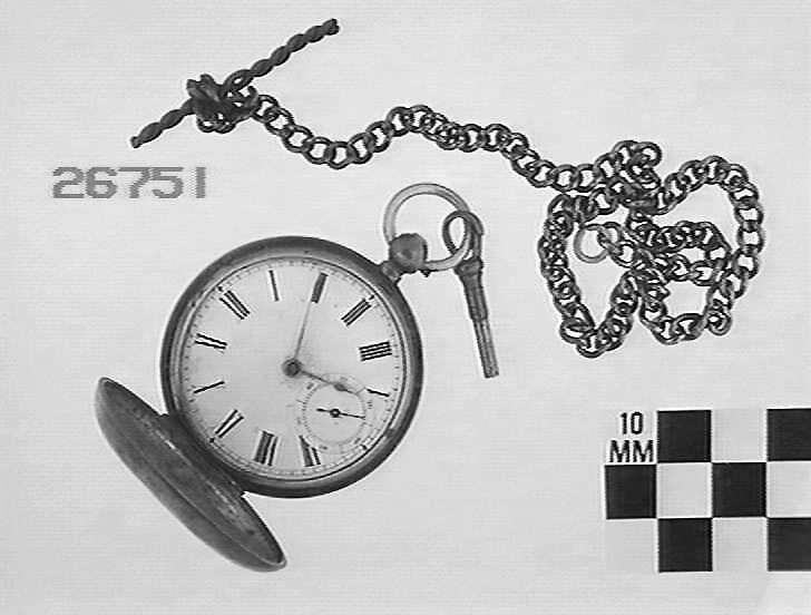 Silver hunter case with Birmingham hallmark of 1880-1881 (anchor and small f). White enamel dial has roman numerals and seconds dial at 6. Key wound spring; lever escapement.