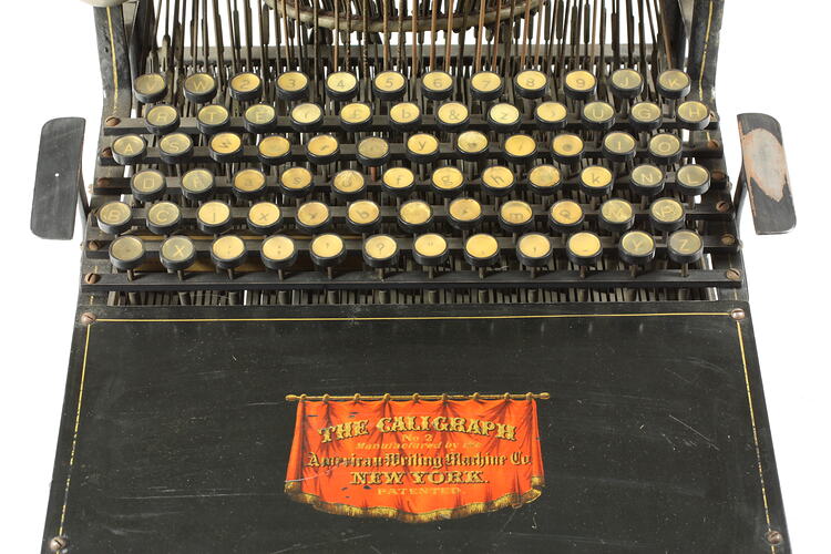 Typewriter of the type-bar class invented by G. W. N. Yost and manufactured by the American Writing Machine Company of New York, USA. The Caligraph was the first machine to use a full keyboard, with each uppercase and lowercase letter, and each number and sign having a separate key.
