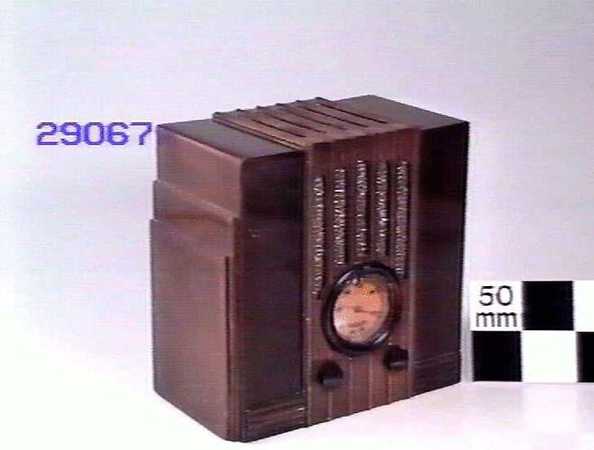 Radiolette model 27 receiver, mantel pattern, manufactured by Amalgamated Wireless (Australasia) Ltd, released in 1934. Like all radios of this period, this receiver used valves, in this case, numbering five. Valves used filaments, which glowed red hot so it was necessary to protect the other components. This set had five valves.