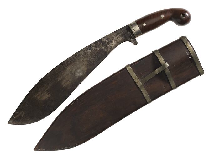 Parang with white bands on sheath. Made by natives of Cocos Island - precise date unknown. Decorated with metal salvaged from the German cruiser SMS Emden, sunk by HMAS Sydney off Cocos Island on 9 November 1914, during World War I. A parang is a curved-bladed knife similar to a machete, used for cutting vegetation.