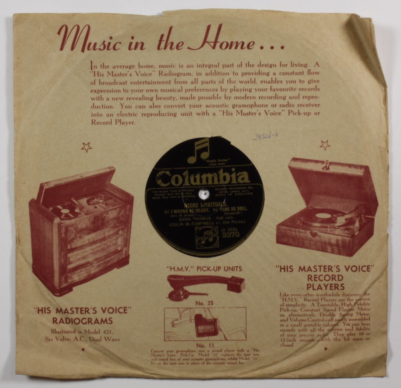 Side A: (logo) Magic Notes / Columbia / (copyright text) / MADE IN ENGLAND / CARRY ME BACK TO OLD VIRGINIE / NEGRO SPRITIUAL. / Arr. W. Golde. / Speed 80 / EDNA THOMAS. Soprano / Colin M. Campbell at the Piano / A 354 / 3370 Side A (run-out): A354 / 16535 Side B: (logo) Magic Notes / Columbia / (copyright text) / MADE IN ENGLAND / NEGRO SPIRITUALS. / (a) I WANNA BE READY. (b) TONE DE BELL. / (Arr. W. Golde.) / (Speed 80) / EDNA THOMAS. Soprano / Colin M. Campbell at the Piano / A 355 / 3370 Side B (run-out): A355 / 16536 Paper sleeve: (advertising for HMV record players) / (advertising for other records available from HMV)