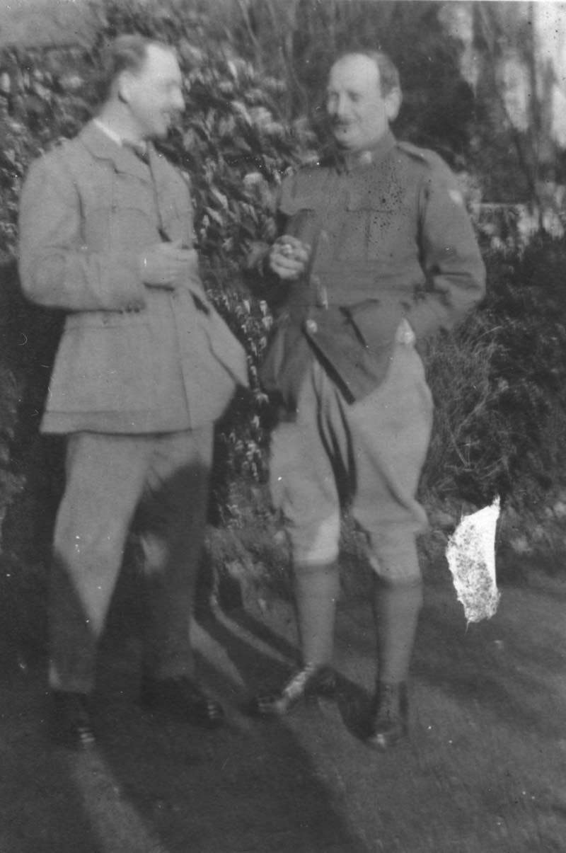 Dudley Townley and another officer. The officer is in uniform, including riding breeches. Townley is in long pants and his uniform jacket. The man on the right is smoking a cigar. Probably taken in Egypt when Townley was with the 5th or 2nd Light Horse. Townley Collection. First World War.