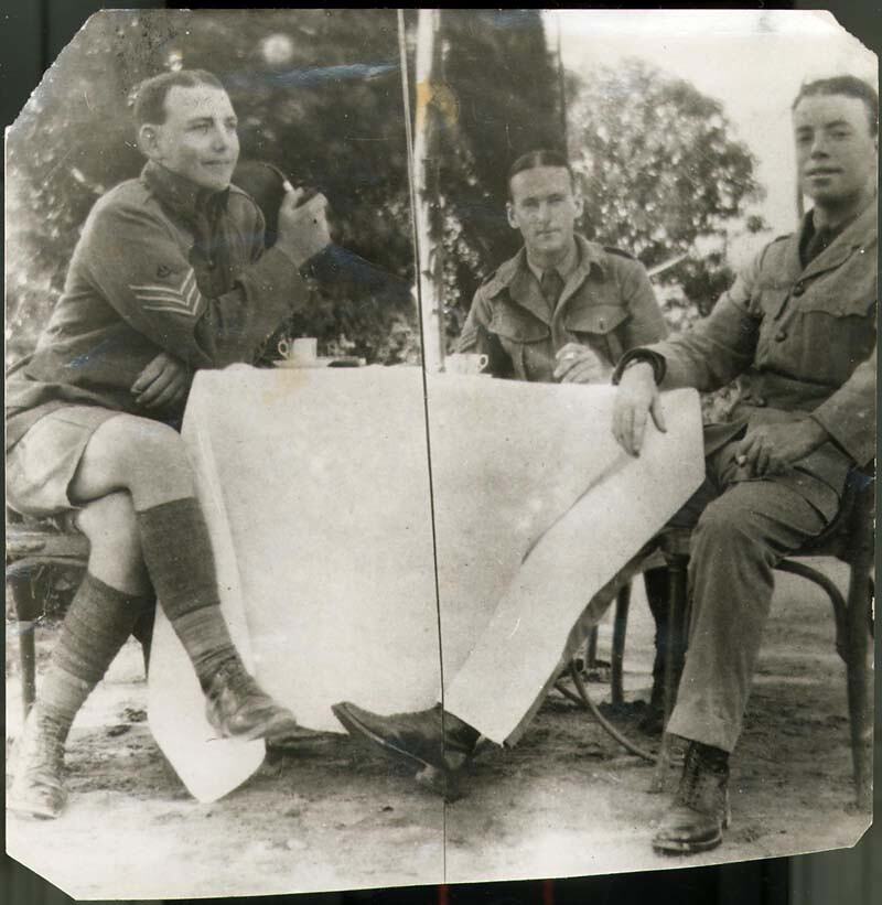 Three men in uniform sitting at a table with a white table cloth. One man is wearing shorts and has sergeant stripes on his uniform jacket.