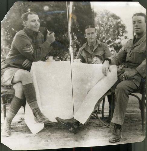 Celebration of the 21st birthday of Sergeant Dudley Townley, with officers Laurie Cadell and Burke, on 21 February 1916. They are seated at a table at the 'Cafe Au Borde du Nil' (cafe by the Nile River) in Maadi, a suburb of Cairo, Egypt. Townley was then serving with the 5th Australian Light Horse Regiment. Light Horse Regiments were then camped at Maadi.
