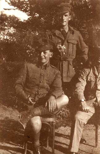 Small sepia photograph of a very young Dudley Townley (seated) and Laurie Cadell in Egypt, 1915, during World War I. Dudley Townley was in Egypt with the 5th and 2nd Light Horse. He was transferred to the 13th Light Horse in 1916 and fought on the Western Front at the Somme and Flanders in France and Belgium.