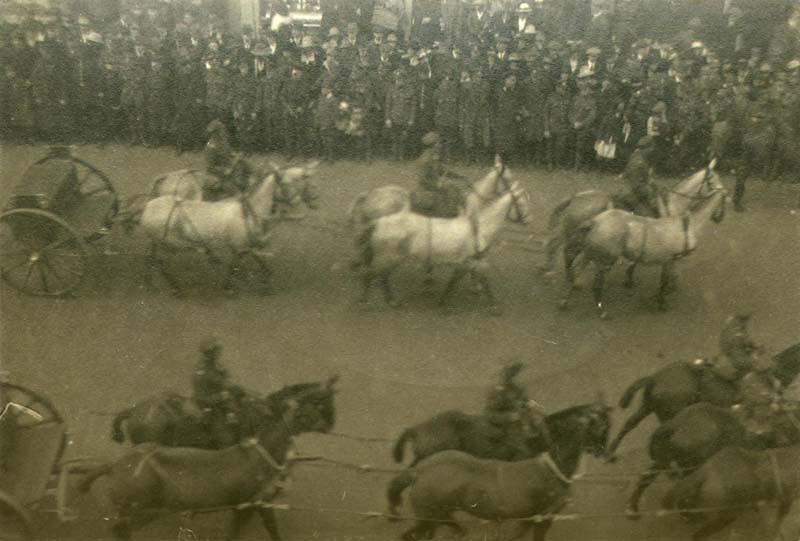Small photograph of Australian Troops in the Victory Parade held on Anzac Day, 1919. Two rows of horses with riders are harnessed to carts, possibly artillery. One row of horses is white, the other black.