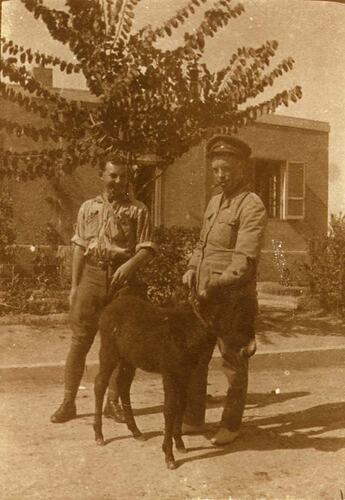 Photograph of Dudley Townley and Burke posing with a small donkey in Egypt. The men are wearing partial Light Horse uniform. Townley enlisted in Queensland near the beginning of World War I. He was in Egypt with the 2nd and 5th Light Horse Regiments, and possibly Gallipoli. He was transferred to the 13th Light Horse and served on the Western Front.