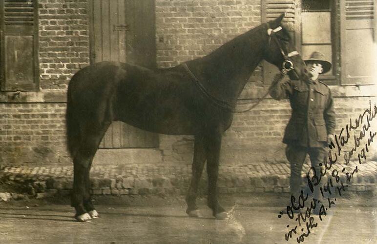Postcard written by Light Horseman Lieutenant Dudley Townley to Freda Gwyn, dated 15 November 1918. The front features a photograph of a horse named 'Old Bill', who the inscription indicates boarded for war with the Australian Light Horse in 1914. Horses ridden by the Light Horsemen were not allowed to return to Australia under quarantine rules. Old Bill may have been transferred to the Artillery sold or killed after the photo was taken.