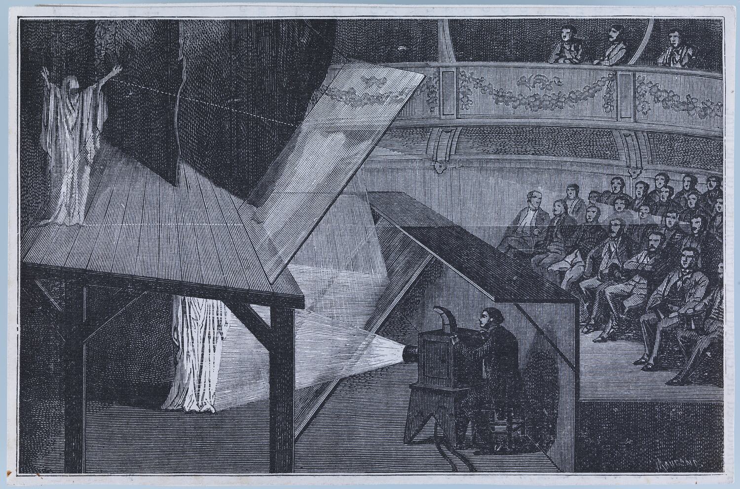 Print showing John Henry 'Professor' Pepper creating his ghost illusion in a theatre.