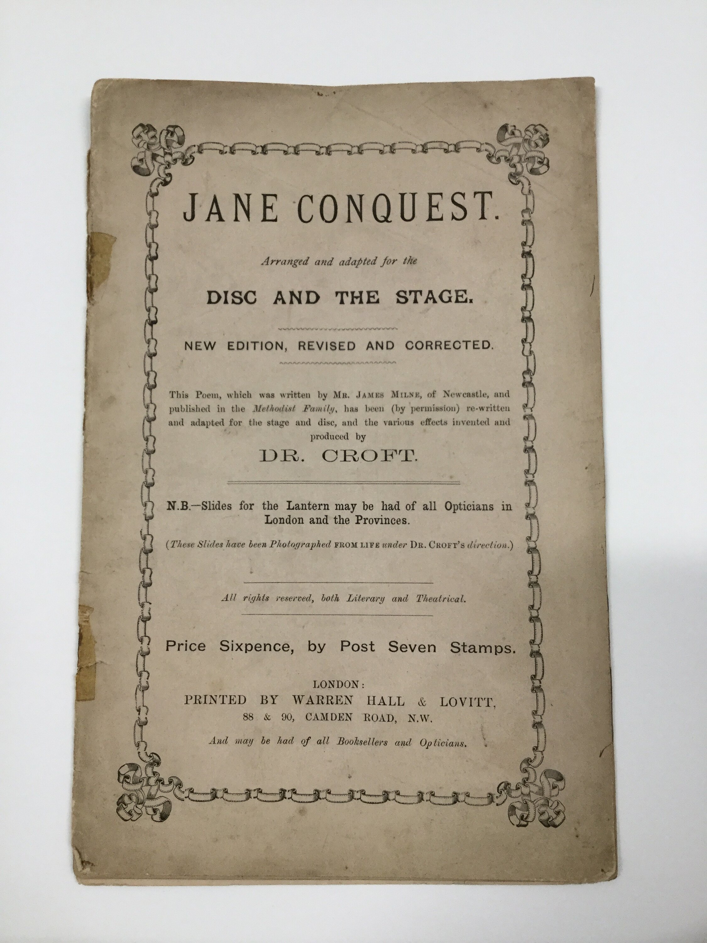 Partial text that can be found on front cover: Jane Conquest poem written by James Milne of Newcastle rewritten and adapted for the stage and disc, and the various effects invented and produced by DR. CROFT