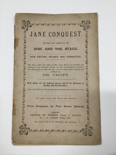 Script in the form of a booklet, which contains a poem entitled 'Jane Conquest' for use during a magic lantern presentation or on stage.
