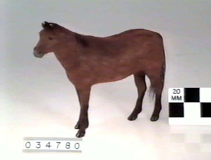 The model consists of a paper mache armature, shaped with bees wax, and chestnut coat consisting of cow hair. The eyes are probably made of glass, with ears & hooves of wood. Ears appear to be damaged with wood showing under hair. A patch of hair missing on left side of belly. Hooves have been polished black. Scale approx. 1:12. [To be confirmed]