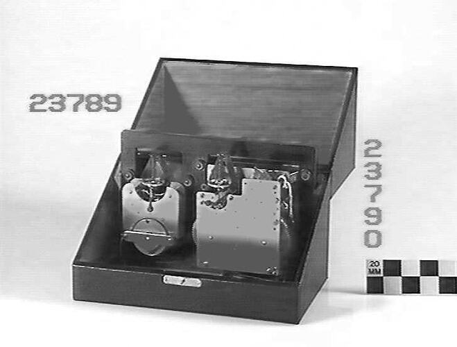 Movement mounted in black leather cloth case with ST 023789.