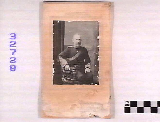 Mounted studio portrait of Major Andrew Kell in full dress uniform, Victorian Garrison Artillery, Port Fairy Battery, in full dress uniform, circa 1890.