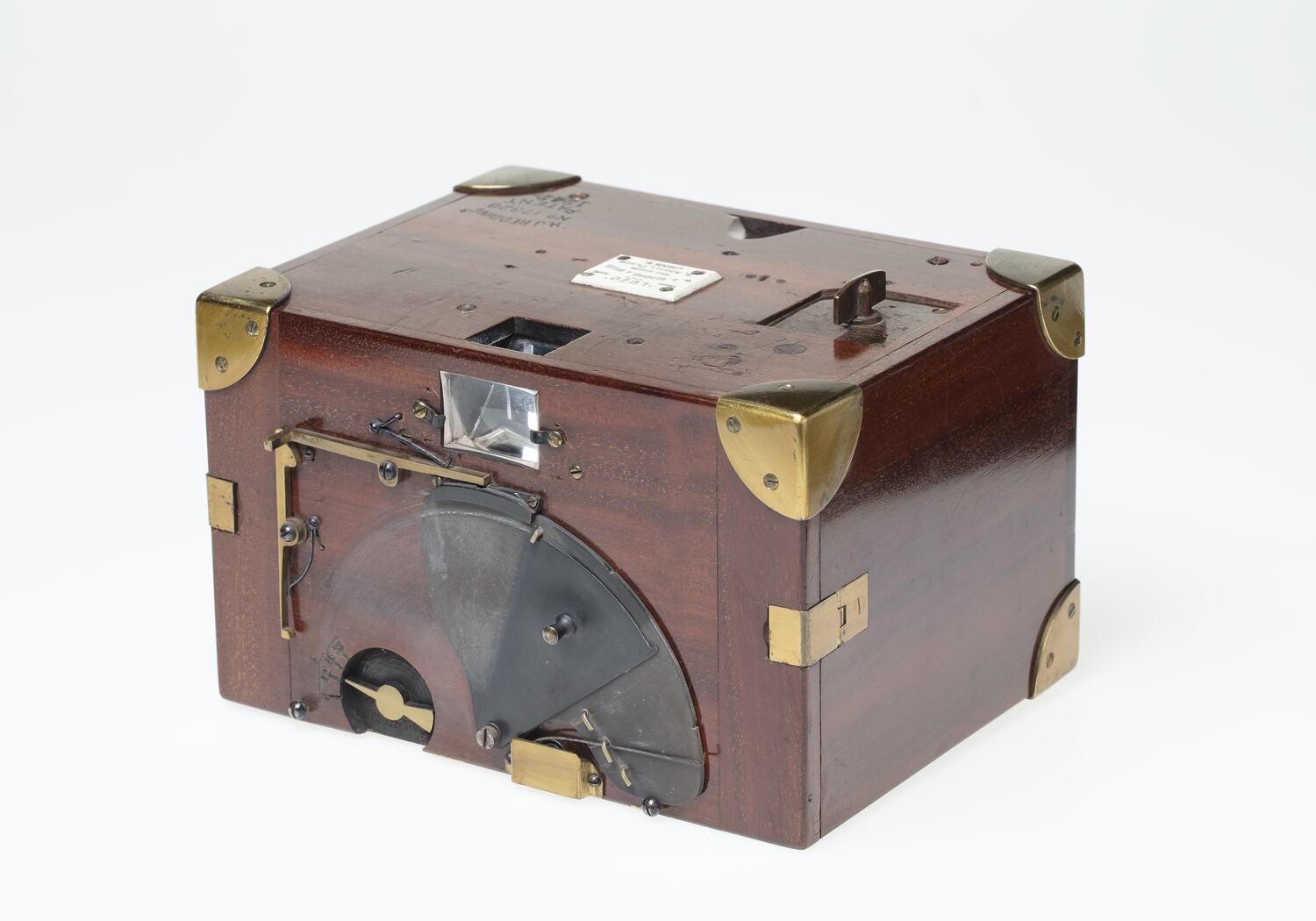 Rectangular box camera, made of polished mahogany with dovetail joints and brass fittings. Viewfinder in centre front with lens below behind metal cover. Small white (possibly bone) plate with inscription on top.