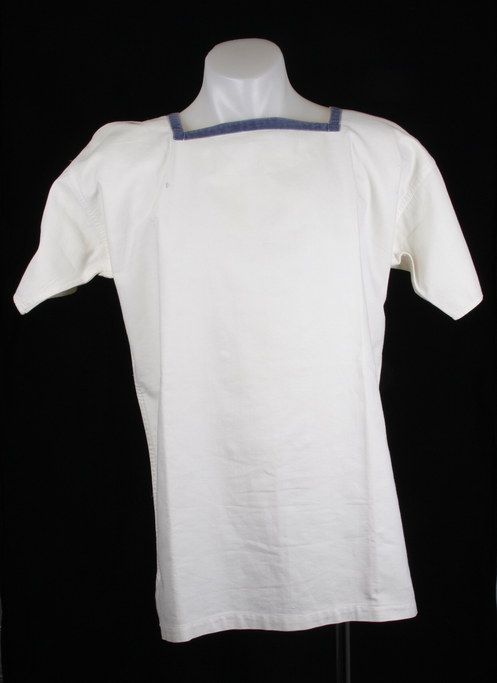 White heavy cotton shirt with square neck and navy binding around neck edge. Short sleeves. Back has keyhole shaped panel sewn on to back from neck to waistline. Splits at bottom of side seams.
