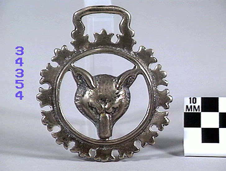 Horse brass depicting a fox head. border of sixteen crowns. Type: cast brass. Date: 1825-1939.
