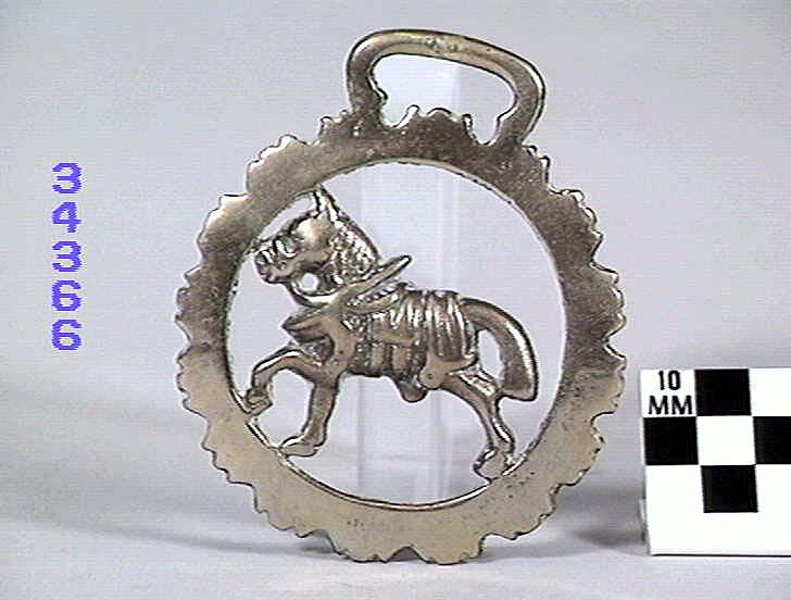 Horse brass depicting a horse in work attire.