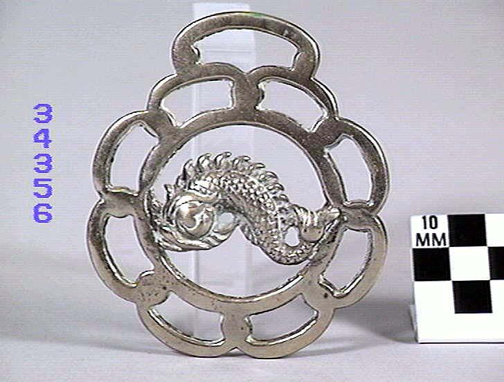 Horse Brass depicting a dolphin. Border has eight loaf- shaped holes in it and a crenate edge. Type: cast brass. Date: 1825-1939.