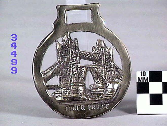 Horse brass. London scene, Tower Bridge. Round border. Type: cast brass. The words "Tower Bridge" are marked at the bottom. Date: 1894-1939