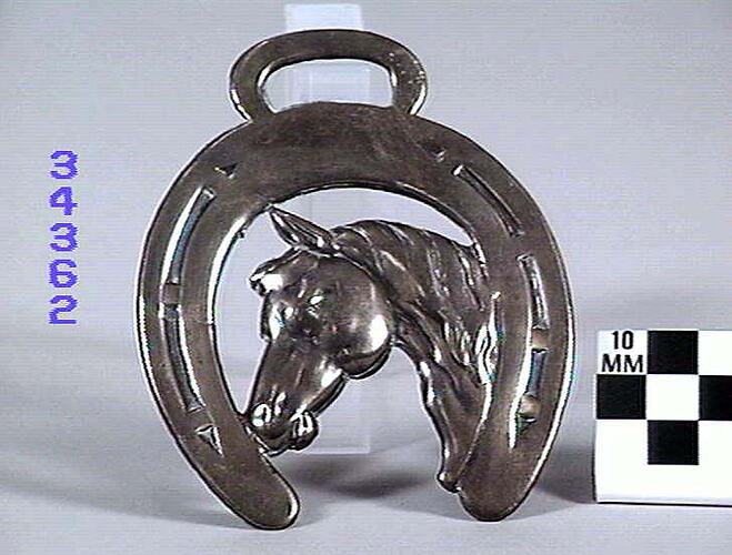 Horse brass depicting a horse head. Horseshoe border. Type: stamped from brass plate. Comments: stamped or possibly formed (repousse style) from brass sheet. Date: 1825-1939.