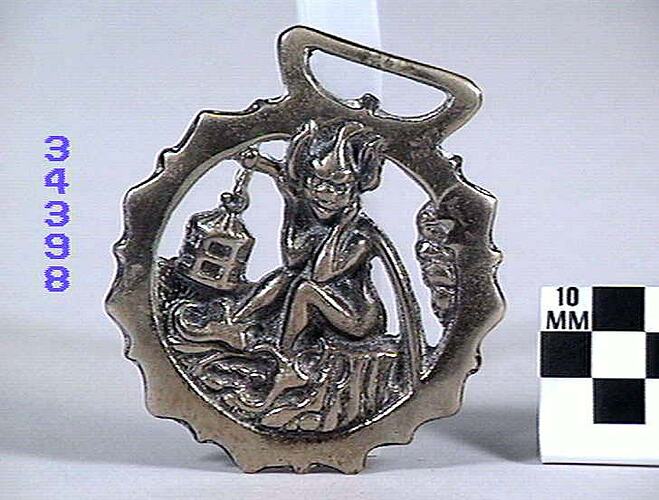 Horse brass depicting a pixie of devon of cornall design. The border is serrated. Type: cast brass. Date: 1825-1939.