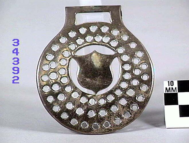 Horse brass - openwork with shield in centre. Type: cast brass. Comments: item has sixty- four perforations in the border. Date: 1824-1939.