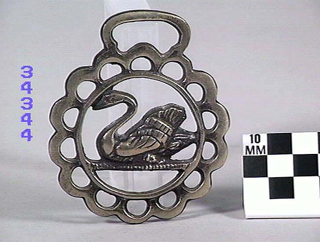 Horse brass depicting a swan sitting at rest. Circular inner border. Fourteen perforations and a crenate outer edge. Type: cast brass. Date: 1825-1939.