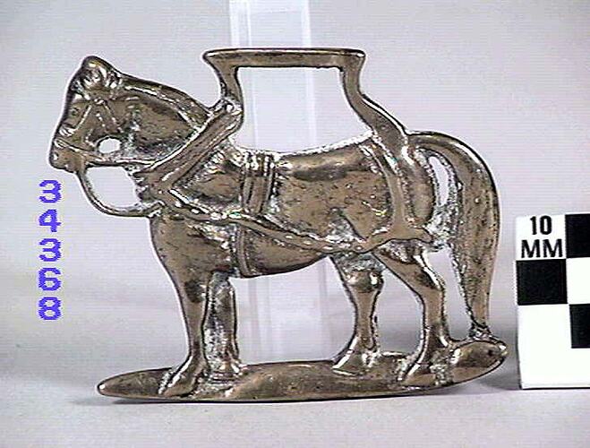 Horse brass depicting a horse in workdress, standing. Type: cast brass. Comments: there is some cracking on the back, on the top of the back legs. Date: 1824-1939.
