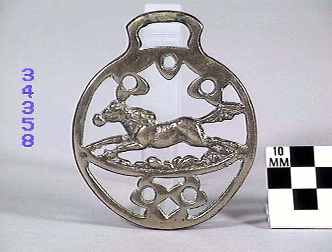 Horse brass depicting a horse galloping. Inner border has five unidentified decorations and a round outer border. Type: cast brass. Date: 1825-1939.