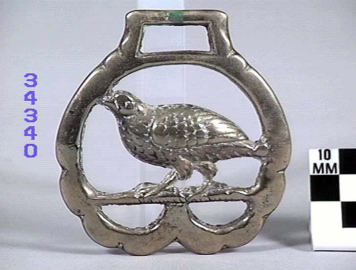 Horse brass depicting a pheasant standing. Kidney shaped inner border and a crenate outer border. Type: cast brass. Date: 1825-1939.